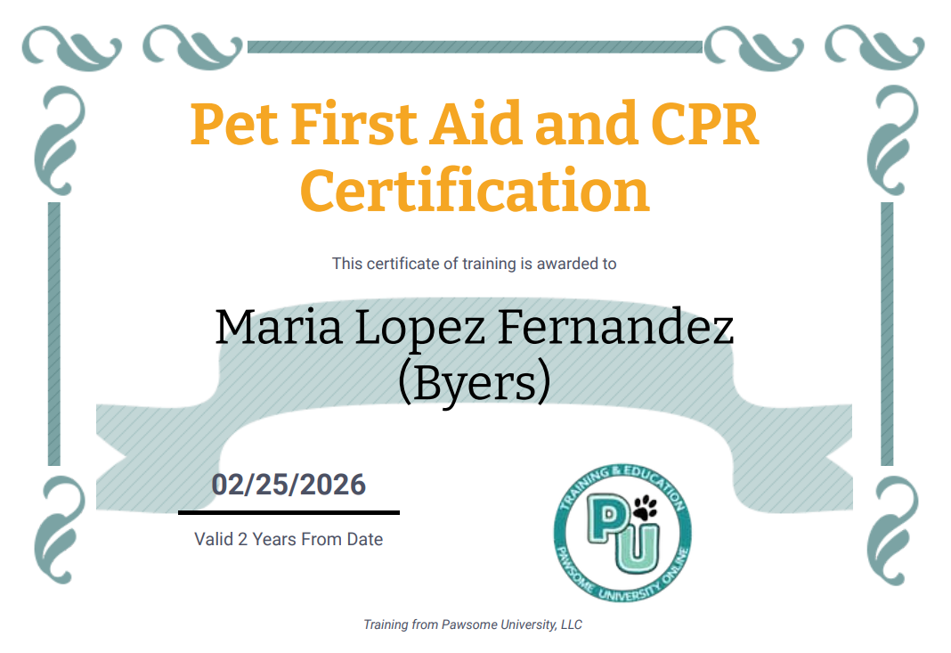 As a Pet First Aid & CPR Certified Caregiver, I am trained to recognize early signs of distress and respond quickly and safely in emergency situations. This certification includes hands-on knowledge of CPR techniques, choking response, wound care, injury stabilization, illness recognition, and emergency preparedness.
